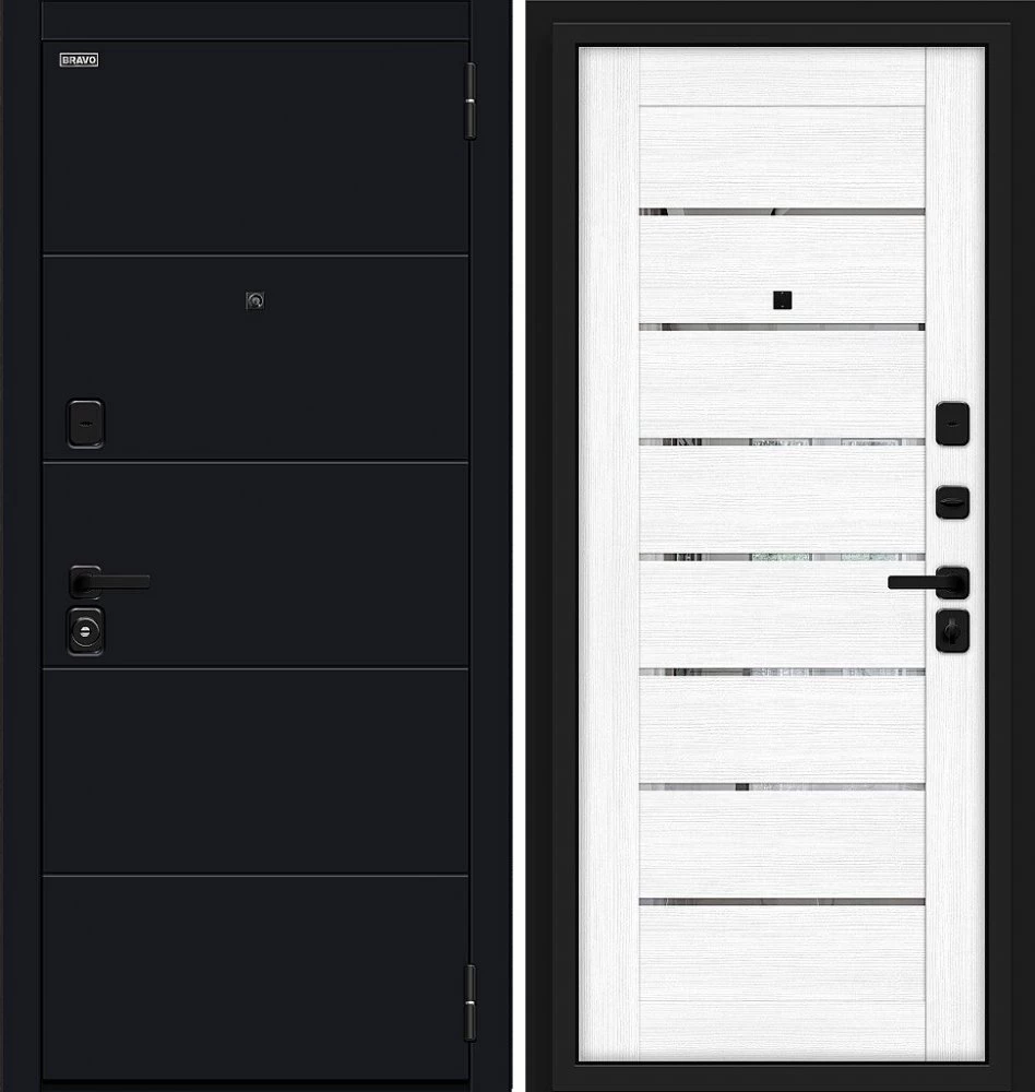 Надежная входная Дверь Браво Прайд Total Black/Snow Melinga премиум класса по цене 40 137 руб. Большая толщина стали защитит от проникновения в ваш дом, квартиру или коттедж. Используется очень качественная фурнитура: замки, цилиндры, ручки, защелки. Покрытие и отделка двери изготовлено под внимательным контролем производителя. Дверь имеет долгий срок службы и гарантию.