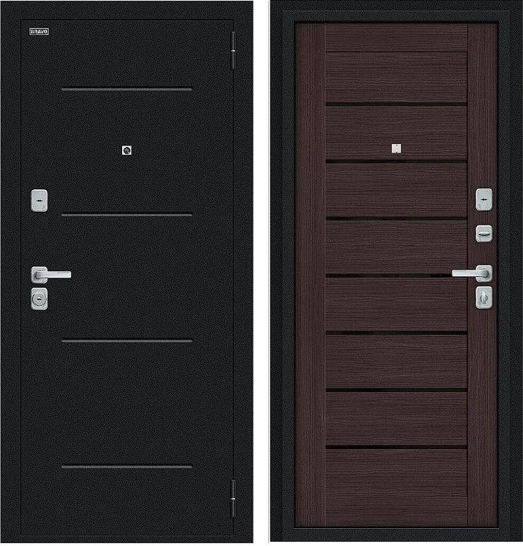 Надежная входная Дверь Браво Техно/BChrome Букле черное/Wenge Melinga премиум класса по цене 33 387 руб. Большая толщина стали защитит от проникновения в ваш дом, квартиру или коттедж. Используется очень качественная фурнитура: замки, цилиндры, ручки, защелки. Покрытие и отделка двери изготовлено под внимательным контролем производителя. Дверь имеет долгий срок службы и гарантию.